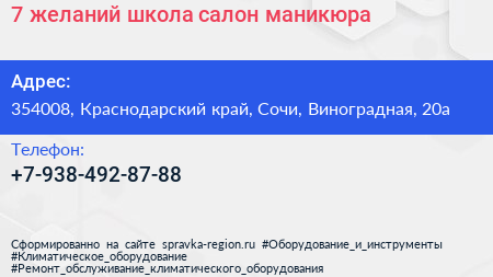 7 желаний, школа-салон маникюра по адресу 354008, Краснодарский край, Сочи, Виноградная, 20а в дальнейшем Организация, размещена в следующих категориях: