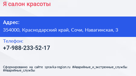 Я, салон красоты по адресу 354000, Краснодарский край, Сочи, Навагинская, 3 в дальнейшем Организация, размещена в следующих категориях: