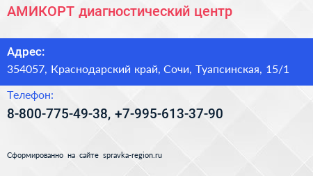 АМИКОРТ, диагностический центр по адресу 354057, Краснодарский край, Сочи, Туапсинская, 15/1 в дальнейшем Организация, размещена в следующих категориях: