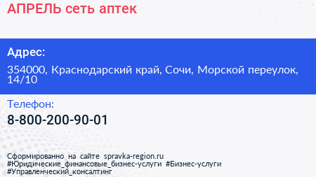 АПРЕЛЬ, сеть аптек по адресу 354000, Краснодарский край, Сочи, Морской переулок, 14/10 в дальнейшем Организация, размещена в следующих категориях: