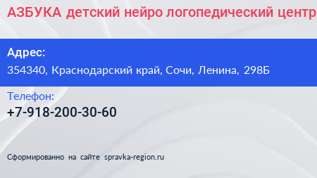 АЗБУКА, детский нейро-логопедический центр по адресу 354340, Краснодарский край, Сочи, Ленина, 298Б в дальнейшем Организация, размещена в следующих категориях: