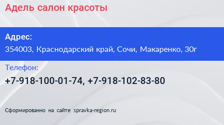 Адель, салон красоты по адресу 354003, Краснодарский край, Сочи, Макаренко, 30г в дальнейшем Организация, размещена в следующих категориях: