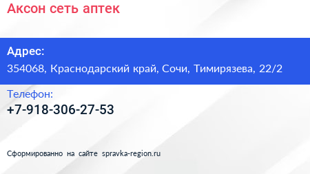 Аксон, сеть аптек по адресу 354068, Краснодарский край, Сочи, Тимирязева, 22/2 в дальнейшем Организация, размещена в следующих категориях: