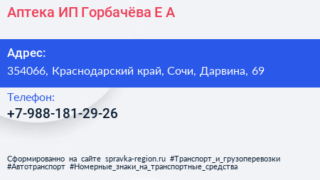 Аптека, ИП Горбачёва Е.А. по адресу 354066, Краснодарский край, Сочи, Дарвина, 69 в дальнейшем Организация, размещена в следующих категориях: