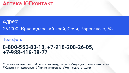 Аптека ЮГконтакт по адресу 354000, Краснодарский край, Сочи, Воровского, 53 в дальнейшем Организация, размещена в следующих категориях: