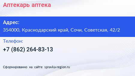 Аптекарь, аптека по адресу 354000, Краснодарский край, Сочи, Советская, 42/2 в дальнейшем Организация, размещена в следующих категориях: