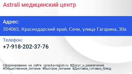 Astrali, медицинский центр по адресу 354065, Краснодарский край, Сочи, улица Гагарина, 30а в дальнейшем Организация, размещена в следующих категориях: