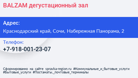 BALZAM, дегустационный зал по адресу Краснодарский край, Сочи, Набережная Панорама, 2 в дальнейшем Организация, размещена в следующих категориях: