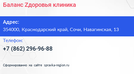 Баланс Zдоровья, клиника по адресу 354000, Краснодарский край, Сочи, Навагинская, 13 в дальнейшем Организация, размещена в следующих категориях: