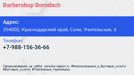 Barbershop Borodach по адресу 354002, Краснодарский край, Сочи, Учительская, 6 в дальнейшем Организация, размещена в следующих категориях: