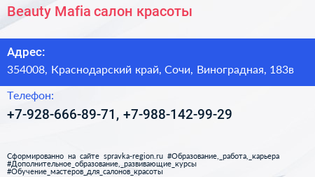 Beauty Mafia, салон красоты по адресу 354008, Краснодарский край, Сочи, Виноградная, 183в в дальнейшем Организация, размещена в следующих категориях:
