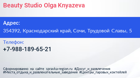 Beauty Studio Olga Knyazeva по адресу 354392, Краснодарский край, Сочи, Трудовой Славы, 5 в дальнейшем Организация, размещена в следующих категориях: