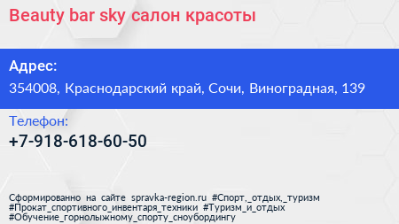 Beauty bar sky, салон красоты по адресу 354008, Краснодарский край, Сочи, Виноградная, 139 в дальнейшем Организация, размещена в следующих категориях: