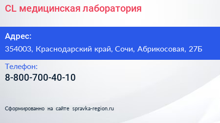CL, медицинская лаборатория по адресу 354003, Краснодарский край, Сочи, Абрикосовая, 27Б в дальнейшем Организация, размещена в следующих категориях: