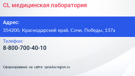 CL, медицинская лаборатория по адресу 354200, Краснодарский край, Сочи, Победы, 137а в дальнейшем Организация, размещена в следующих категориях: