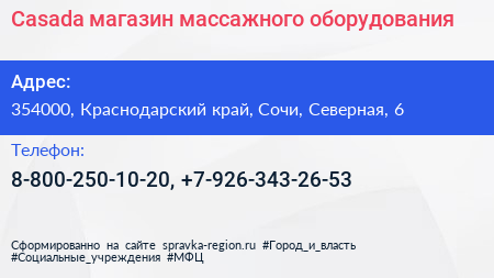 Casada, магазин массажного оборудования по адресу 354000, Краснодарский край, Сочи, Северная, 6 в дальнейшем Организация, размещена в следующих категориях: