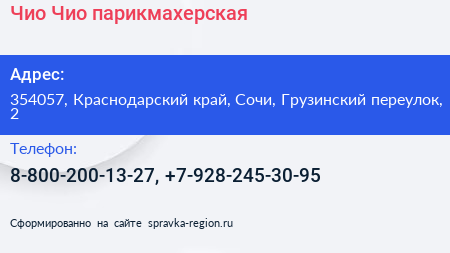 Чио Чио, парикмахерская по адресу 354057, Краснодарский край, Сочи, Грузинский переулок, 2 в дальнейшем Организация, размещена в следующих категориях: