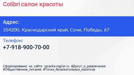 Colibri, салон красоты по адресу 354200, Краснодарский край, Сочи, Победы, 67 в дальнейшем Организация, размещена в следующих категориях:
