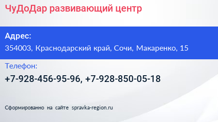 ЧуДоДар, развивающий центр по адресу 354003, Краснодарский край, Сочи, Макаренко, 15 в дальнейшем Организация, размещена в следующих категориях: