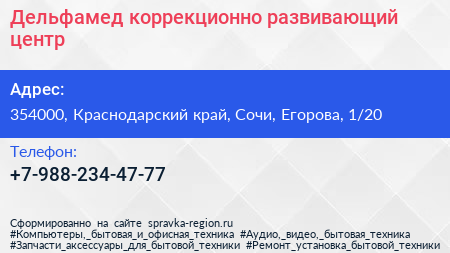 Дельфамед, коррекционно-развивающий центр по адресу 354000, Краснодарский край, Сочи, Егорова, 1/20 в дальнейшем Организация, размещена в следующих категориях: