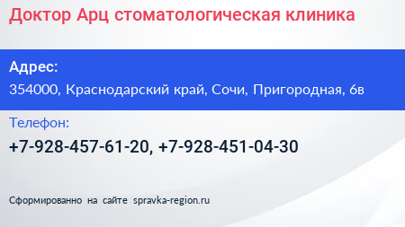 Доктор Арц, стоматологическая клиника по адресу 354000, Краснодарский край, Сочи, Пригородная, 6в в дальнейшем Организация, размещена в следующих категориях:
