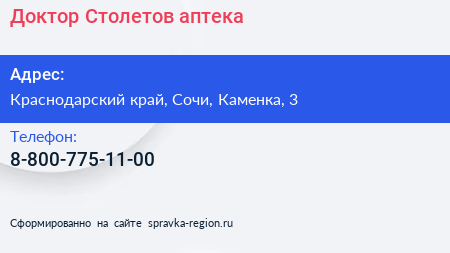 Доктор Столетов, аптека по адресу Краснодарский край, Сочи, Каменка, 3 в дальнейшем Организация, размещена в следующих категориях: