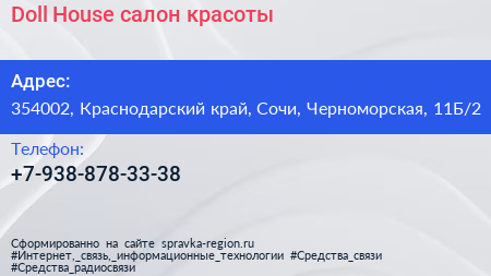 Doll House, салон красоты по адресу 354002, Краснодарский край, Сочи, Черноморская, 11Б/2 в дальнейшем Организация, размещена в следующих категориях: