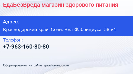 ЕдаБезВреда, магазин здорового питания по адресу Краснодарский край, Сочи, Яна Фабрициуса, 58 к1 в дальнейшем Организация, размещена в следующих категориях: