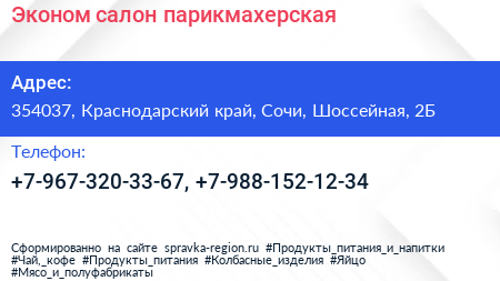 Эконом, салон-парикмахерская по адресу 354037, Краснодарский край, Сочи, Шоссейная, 2Б в дальнейшем Организация, размещена в следующих категориях: