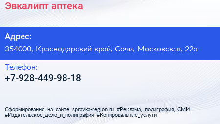 Эвкалипт, аптека по адресу 354000, Краснодарский край, Сочи, Московская, 22а в дальнейшем Организация, размещена в следующих категориях: