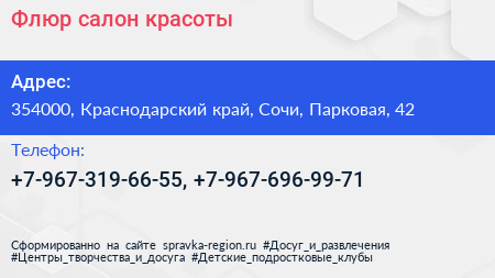 Флюр, салон красоты по адресу 354000, Краснодарский край, Сочи, Парковая, 42 в дальнейшем Организация, размещена в следующих категориях: