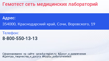 Гемотест, сеть медицинских лабораторий по адресу 354000, Краснодарский край, Сочи, Воровского, 19 в дальнейшем Организация, размещена в следующих категориях: