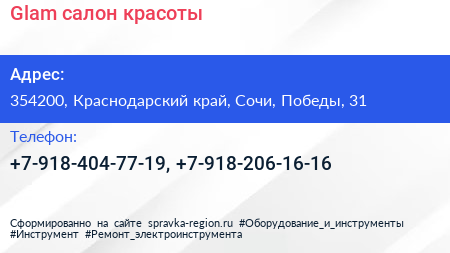 Glam, салон красоты по адресу 354200, Краснодарский край, Сочи, Победы, 31 в дальнейшем Организация, размещена в следующих категориях: