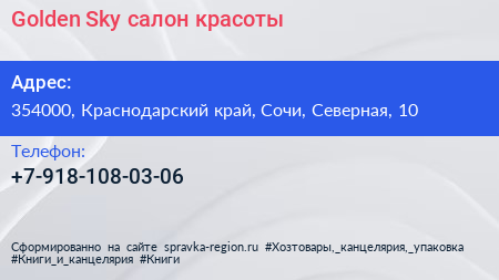 Golden Sky, салон красоты по адресу 354000, Краснодарский край, Сочи, Северная, 10 в дальнейшем Организация, размещена в следующих категориях:
