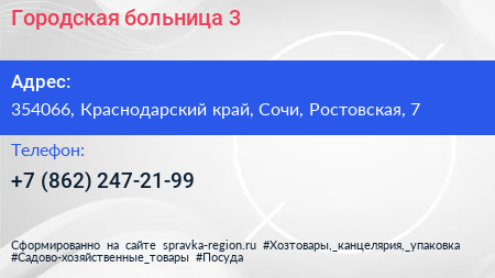 Городская больница №3 по адресу 354066, Краснодарский край, Сочи, Ростовская, 7 в дальнейшем Организация, размещена в следующих категориях: