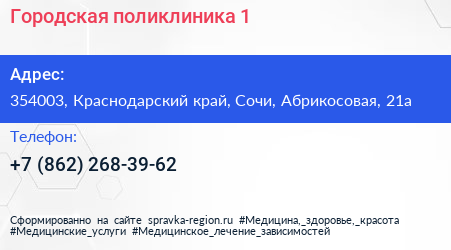 Городская поликлиника №1 по адресу 354003, Краснодарский край, Сочи, Абрикосовая, 21а в дальнейшем Организация, размещена в следующих категориях: