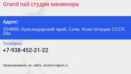 Grand nail, студия маникюра по адресу 354000, Краснодарский край, Сочи, Конституции СССР, 26а в дальнейшем Организация, размещена в следующих категориях: