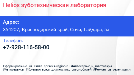 Helios, зуботехническая лаборатория по адресу 354207, Краснодарский край, Сочи, Гайдара, 5а в дальнейшем Организация, размещена в следующих категориях: