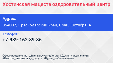 Хостинская мацеста, оздоровительный центр по адресу 354037, Краснодарский край, Сочи, Октября, 4 в дальнейшем Организация, размещена в следующих категориях: