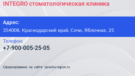 INTEGRO, стоматологическая клиника по адресу 354008, Краснодарский край, Сочи, Яблочная, 25 в дальнейшем Организация, размещена в следующих категориях: