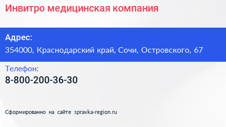 Инвитро, медицинская компания по адресу 354000, Краснодарский край, Сочи, Островского, 67 в дальнейшем Организация, размещена в следующих категориях: