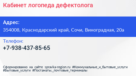 Кабинет логопеда-дефектолога по адресу 354008, Краснодарский край, Сочи, Виноградная, 20а в дальнейшем Организация, размещена в следующих категориях: