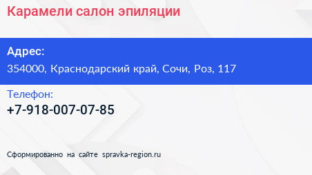 Карамели, салон эпиляции по адресу 354000, Краснодарский край, Сочи, Роз, 117 в дальнейшем Организация, размещена в следующих категориях:
