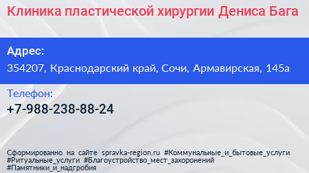 Клиника пластической хирургии Дениса Бага по адресу 354207, Краснодарский край, Сочи, Армавирская, 145а в дальнейшем Организация, размещена в следующих категориях: