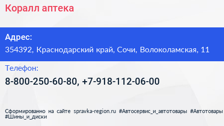 Коралл, аптека по адресу 354392, Краснодарский край, Сочи, Волоколамская, 11 в дальнейшем Организация, размещена в следующих категориях: