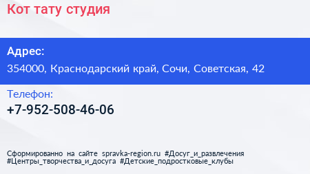 Кот, тату-студия по адресу 354000, Краснодарский край, Сочи, Советская, 42 в дальнейшем Организация, размещена в следующих категориях: