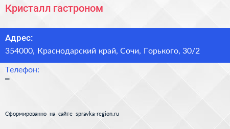 Кристалл, гастроном по адресу 354000, Краснодарский край, Сочи, Горького, 30/2 в дальнейшем Организация, размещена в следующих категориях:
