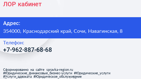 ЛОР-кабинет по адресу 354000, Краснодарский край, Сочи, Навагинская, 8 в дальнейшем Организация, размещена в следующих категориях: