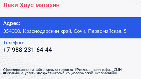 Лаки Хаус, магазин по адресу 354000, Краснодарский край, Сочи, Первомайская, 5 в дальнейшем Организация, размещена в следующих категориях: