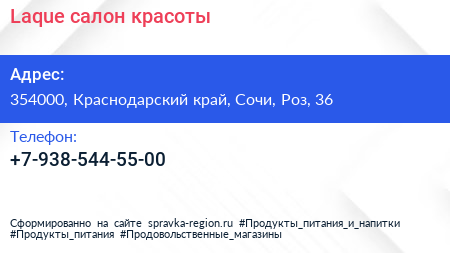 Laque, салон красоты по адресу 354000, Краснодарский край, Сочи, Роз, 36 в дальнейшем Организация, размещена в следующих категориях:
